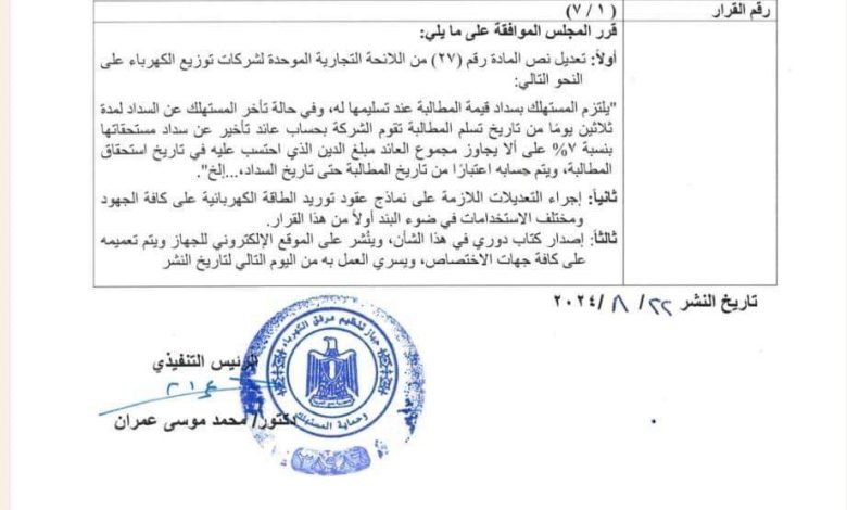 دعماً للمستثمرين ، وتيسيراً عليهم ، وتحسيناً لبيئة العمل ، مما يسهم في تعزيز الاستثمارات ، ودعم النمو الاقتصادي ، أصدر وزير الكهرباء والطاقة المتجددة ، الدكتور محمود عصمت ، القرار رقم(5) لسنه 2024 بتعديل بعض القوانين المتعلقة بغرامات التأخير ، وذلك استجابةً للمذكرات المقدمة ، بتاريخ 22 أغسطس الماضي ، من الدكتور صبحي نصر ، عضو مجلس إدارة الاتحاد المصري لجمعيات المستثمرين ، رئيس المركز الوطني للتعليم المزدوج التكنولوجي ، نائب رئيس جمعية مستثمري العاشر من رمضان ، رئيس جمعية مستثمري السويس ، خلال شهري مارس وأبريل الماضيين .
