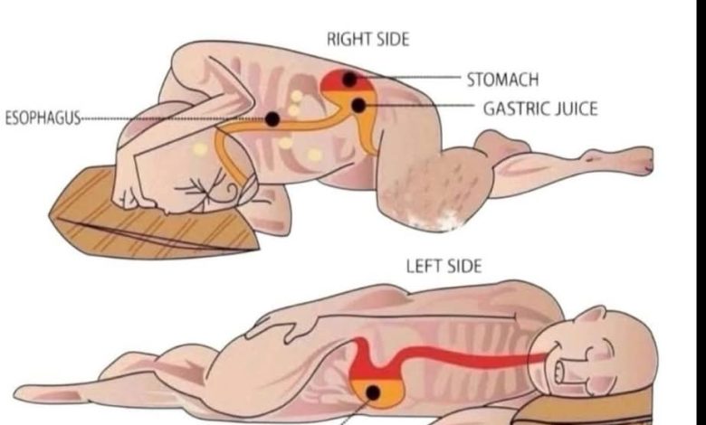 إن الطعام يستغرق في الحالة الطبيعية من 2 إلى 4 ساعات في المعدة، فإذا كان الإنسان نائم على الشِقِّ الأيسر، فسيستغرق هضم الطعام من 5 إلى 8 ساعات، لأن الرئة اليمنى وهي الكبيرة، تضغط على القلب والكبد وهو أكبر الأعضاء، فيبقى معلقاً قلقاً .