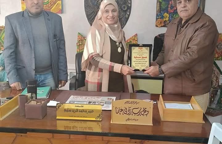 انابت الاستاذة الدكتورة / منى الرفاعى رئيس مجلس ادارة جريدة وموقع الصدارة الدولية والاستاذ حسن نصار رئيس مجلس الادارة التنفيذى..الاستاذ/ العربى اسماعيل مدير مكتب قطاع القناة ودمياط لتسليم درع التميز فى التربية الفنية للاستاذة الفنانه /عبير محمد فريد سليم الموجه العام لمادة التربية الفنية بمحافظة بورسعيد بعد فوزها بدرع التميز فى ” تطوير التربية الفنية ” على مستوى مدن قطاع القناة ودمياط واكدت سيادتها ان درع التميز يمنح للمرة الاولى على المستوى العام حيث شارك توجية التربية الفنية ببورسعيد فى العديد والعديد من المسابقات الفنية على مستوى الجمهورية وحصوله على المراكز الاولى فى كافة المسابقات التى تم تنظيمها وتطوير المادة من خلال المعلمين والمعلمات والجهد المبذول لتطوير المادة والمشاركات العديدة على مستوى الجمهورية والظهور بشكل وصورة مشرفة حضر مراسم التكريم الاستاذ الفنان / محمد البخشة الموجه الاول للتربية الفنية و السادة موجهى المادة وبعض السادة المعلمين والمعلمات كما شارك التكريم الاستاذ الفنان / محمد عبد الواحد خبير المادة والموفد اعلاميا للمشاركة فى التكريم .
