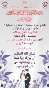 تتقدم أسرة جريدة الصدارة الدوليه بخالص التهاني والتبريكات للدكتورة أمل فرج مدير قسم الارشاد الاسرى بالجريدة بمناسبة زفاف نجلها المهندس عبدالرحمن على المهندسة روان ….بالرفاء والبنين…..مع تحيات رئيس مجلس الادارة التنفيذى ا/حسن نصار ورئيس مجلس إدارة جريدة الدكتورة منى الرفاعى 🤍
