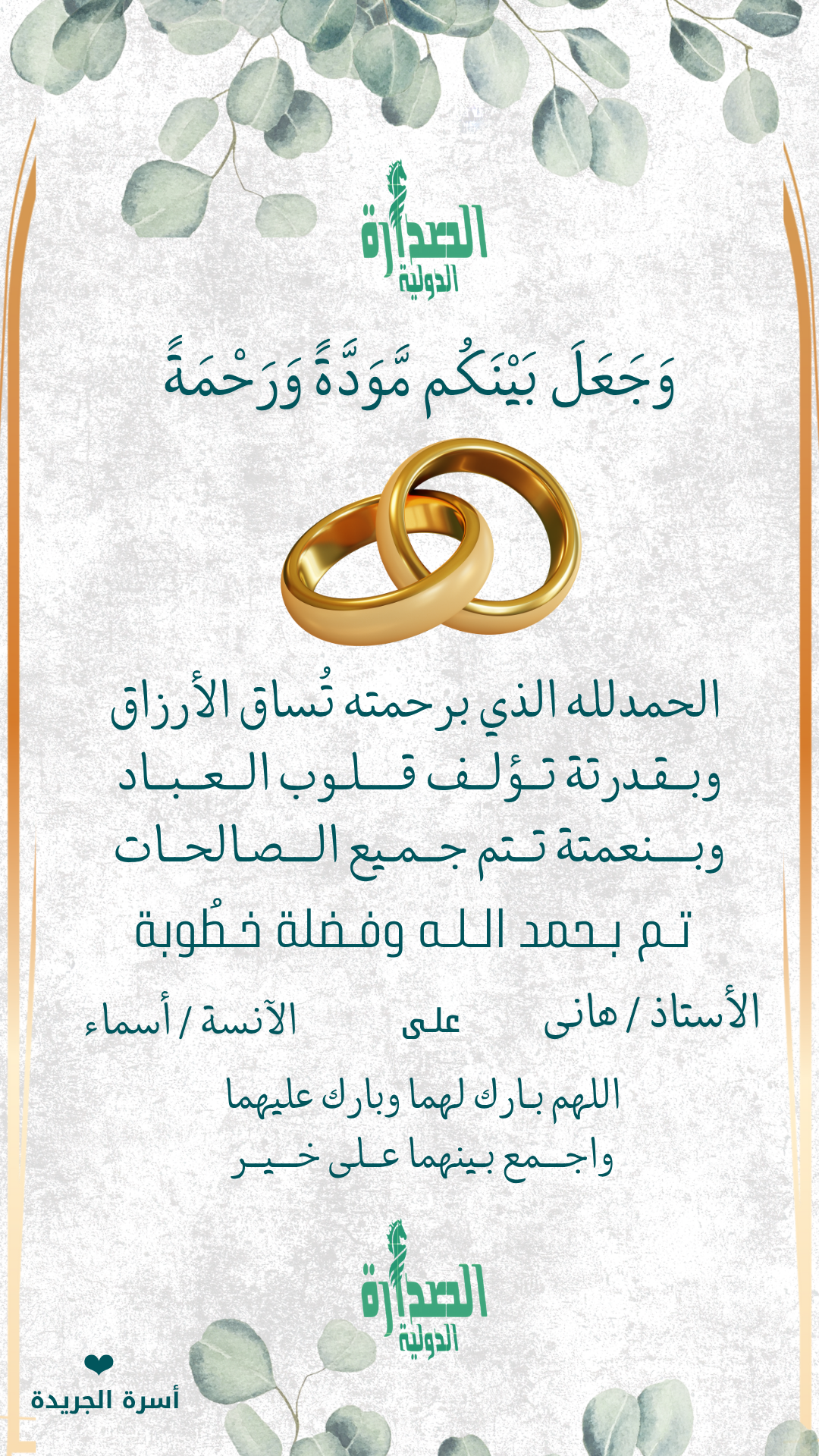 مع خالص دعواتنا لهم بدوام الفرح والسعادة وأن يجمع بينهما على خير.