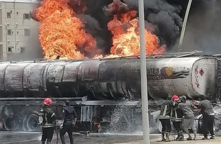 حـ.ريق بسيارة محمّلة بالوقود أمام محطة للتعبئة بمدينة العاشر من رمضان والدفع بسيارات إطفاء للسيطرة على النيران ومنع امتدادها وجاري السيطرة عليها من قبل رجال الإطفاء