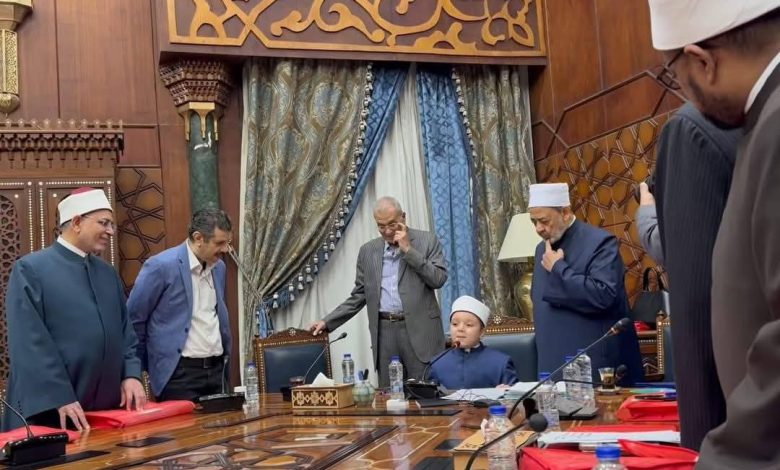 شيخ الأزهر يُجلِس طفلا على كرسيه ويستمع إليه واقفا وهو يقرأ بعض المتون العلمية