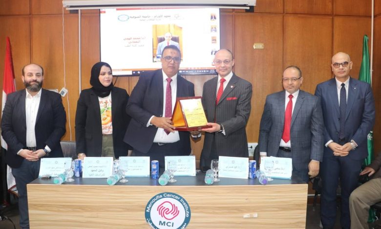 وفي كلمته رحب الدكتور محمد فهمي النعماني عميد كلية الطب ورئيس مجلس إدارة المستشفيات الجامعية بالحضور معربا عن اعتزازه بالتواجد في معهد الاورام ومؤكدا ان معهد الاورام يمثل نموذجا مشرفا لما يمكن تحقيقه من خلال الدعم المستمر من القيادة العليا والعمل الجاد حتى اصبح الحلم واقعا وكيانا طبيا متميزا يسير بخطى ثابتة نحو مزيد من التطور والارتقاء بالخدمات الطبية المقدمة واضاف سيادته ان العمل داخل المنظومة الطبية يقوم على روح الفريق الواحد والتكامل بين جميع الادارات والاقسام بهدف تقديم خدمة طبية باعلى مستوى من الجودة والتميز بما يليق بالمريض مشيرا الى ان ما تحقق داخل المعهد يعد بداية قوية لاعتماد باقي منشآت الجامعة ومؤكدا ان الجميع يعمل في تكامل وان النجاح هو نجاح جماعي يعكس وحدة الهدف والعمل المشترك