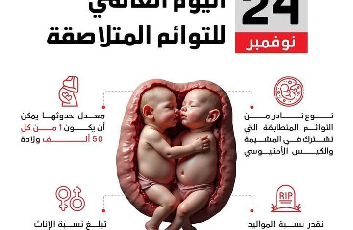ويحتفل العالم في 24 نوفمبر من كل عام باليوم العالمي للتوائم الملتصقة، وهو اليوم الذي خصصته الأمم المتحدة لتأكيد ضرورة معالجة حالة التوائم السيامية، برفع مستوى الوعي بحالاتهم على جميع المستويات، ومن خلال اتباع نهج شامل طوال دورة الحياة، إذ تعتبر التوائم الملتصقة حالة نادرة ويقدر معدل حدوثها بنحو 1 لكل 50 ألف ولادة.