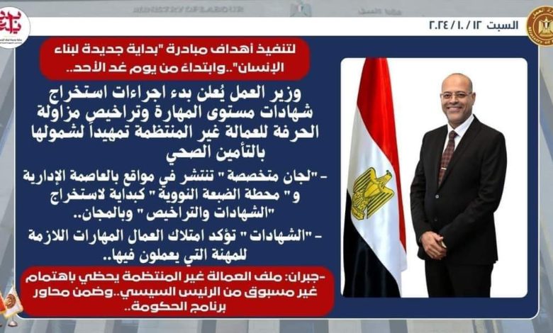 وزير العمل يُعلن بدء اجراءات استخراج شهادات مستوى المهارة وتراخيص مزاولة الحرفة للعمالة غير المنتظمة تمهيداً لشمولها بالتأمين الصحي..