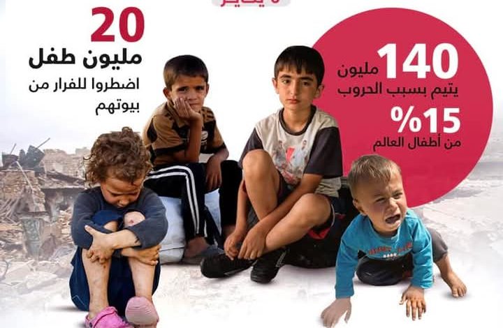 فيما أوضحت منظمة الأمم المتحدة للطفولة (يونيسيف)، في بحثٍ أجرته بالتعاون مع عدد من منظمات المجتمع المدني حول العالم أن “هناك أكثر من 140 مليون طفل يتيم في العالم، فقدوا عائلاتهم بسبب الحروب أو الكوارث الطبيعية، لافتة إلى أنه في كل يوم، يتحول نحو 10 آلاف طفل إلى أيتام بسبب الحروب، والنزاعات، والأوبئة، والمجاعات، وعدد من الأسباب المشابهة.